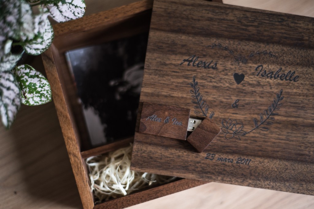 - Tout le reportage photo sera remis sur une jolie clé USB en bois gravée. Selon la formule choisie, elle sera remise dans un coffret en bois accompagnée également de tirages photos (100 à 150 tirages). Le coffret est disponible en bois clair ou foncé, pour garder un magnifique souvenir de cette journée.